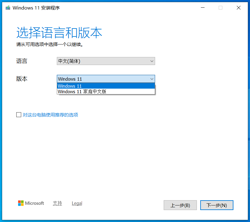 将U盘插入电脑,双击MediaCreationTool.exe运行,随着Windows的logo一闪而过,首先映入眼帘的是许可条款,我们无脑选择接受,接着安装程序会自己进行准备工作,稍等片刻,程序会让你选择语言和版本,取消勾选下面的“对这台电脑使用推荐的选项”,你就可以自由选择你所需要的语言和版本了(Windows各版本的区别我后续文章也会写到)选定后直接下一步。